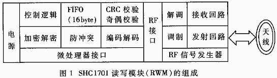 本系统采用上海华虹集成电路公司开发的SHC1701 RF读写模块。它主要由射频和SHC1501大规模集成电路构成,共同安装在PCB板上,同时安装屏蔽罩,可完成读写器与IC卡之间的各种交互功能,包括调制/解调、加密/解密、认证、读写、加/减等,并具有同微处理器的接口。其基本结构如图1所示。
