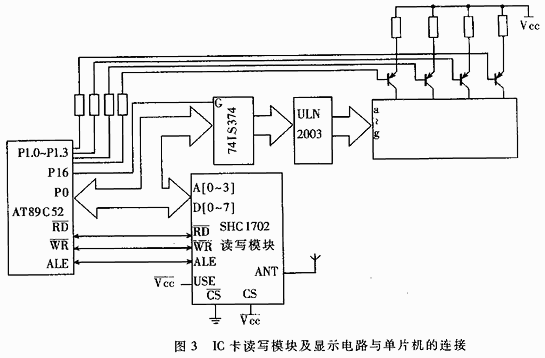 SHC1701 RF模块是IC卡读写器的核心单元,它由SHC1501专用电路和RF电路等组成,覆盖了所有对非接触式IC卡SHC1101的访问操作。IC卡读写模块及显示电路与单片机的接口如图3所示。图中采用4位共阳极的动态数码显示管,显示字符由单片机P0口送至锁存器74LS374锁存,再经显示驱动芯片ULN2003驱动数据管显示,P1.0~P1.3分别控制每一位的动态显示。显示电路用显示可供使用的电度数。当读卡发生错误时,将显示错误信息。在供电部门存款时,将显示存入电卡中的电度数。