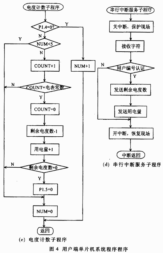 单片机系统程序由主监控程序、IC卡处理子程序、电度计数子程序、串行中断服务子程序等组成,其框图分别见图4(a)、(b)、(c)、(d)。