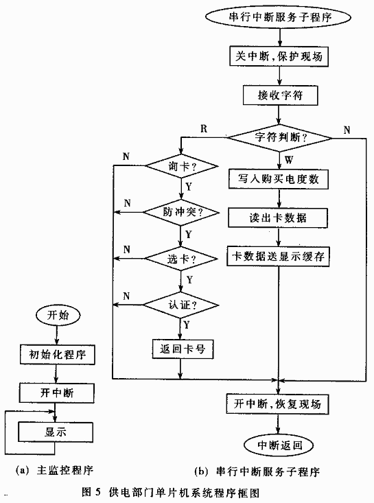 (2)接收微机发来的控制字符。执行串行中断服务子程序,如控制字符为R则执行对IC卡的询卡、防冲突、选卡、认证等操作,并返回给微机卡号;如控制字符为W则将用户购买的电度数写入IC卡,再读出写入的电度数,然后停卡。