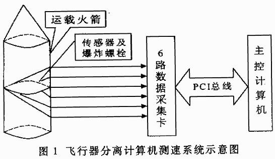 飞行器飞行中的分离速度是指爆炸螺栓爆炸裂后,各级助推器之间以及助推器与载荷之间的分离速度,是飞行器的关键参数之一,直接决定了飞行器能否安全分离。因而在飞行器的地面试验研究中,需要对飞行器分离速度进行测量分析。传统的测量方法是采用高速摄像机,飞行器分离时从各个角度进行高速摄像,事后对图像信号进行处理,从而获得飞行器分离的速度、加速度信息。但这种方式存在成本高、精度低、难以操作、实时性差等缺点。因此,随着飞行器试验研究的不断深入,迫切需要一种高精度、高性能价格比的测速系统。本文介绍了一种用于飞行器地面分离实验的计算机测速系统,系统示意图见图1。该系统包括传感器和计算机数据采集处理分析系统。多通道高速大容量数据采集处理分析系统是飞行器分离测速系统的关键部分。主要用于在飞行器分离时对均匀分布于飞行器分离截面的传感器信息进行6路并行零相差高速长时间不间断采集、实时或事后数据处理分析,从而得到飞行器分离的速度及加速度曲线。数据采集与处理系统由6通道数据采集卡、主控微机及系统主控、数据处理分析软件构成。该系统已成功地用于某飞行器的地面试验研究。