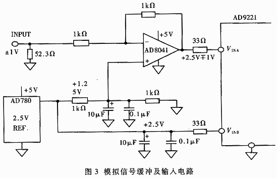 为了采集6路并行的位移传感器信号,系统需要6路并行的A/D转换电路。本系统采用了美国ANALOG DEVICE公司的12位高速单片A/D转换芯片AD9221作为A/D电路的核心器件。AD9221具有睡内采样保持电路以及低温度飘移系数的基准电源,仅以单一的+5V电源工作。它的无杂散动态范围可达80dB,很适合本系统的要求;同时高速A/D电路的模拟信号输入采用单电源的缓冲运算放大器,避免了毁灭性的ADC过激励。模拟信号缓冲及输入电路见图3。