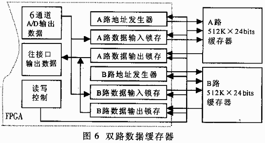6通道A/D转换后组合成24位数据输出,每路需要用3片HM628512构成512K×24bits的缓存器。两路各3片HM628512的地址信号及控制信号都由FPGA给出。同一路的3片存储器以位扩展的方式连接在一起,共用一组地址线,数据线分开。为了实现两组存储器同时进行读写操作,需要将数据输入总线和输出总线隔离。采用FPGA进行地址发生及逻辑控制,极大地减小了系统设计的难度。双路存储器(A路,B路)的构成原理框图如图6。
