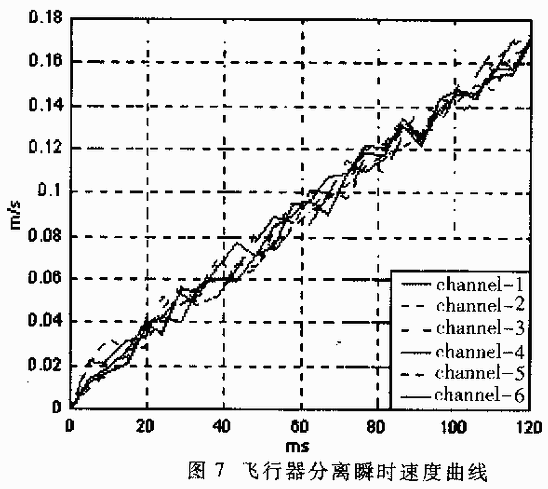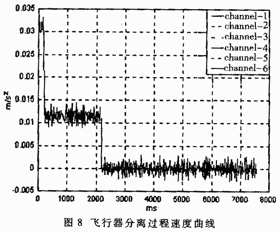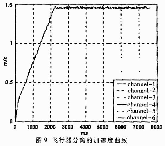 实验中采集到的数据经过平滑等预处理后,可以得到飞行器分离的速度及加速度数据,飞行器分离的速度曲线见图7、图8,加速度曲线见图9。结果表明,测速系统在测量精度上比高速摄像机提高了两个数量级,更好地保证了飞行器的地面实验。配以不同的传感器以及相应的数据处理分析软件,该系统可以应用于不同的测量分析领域,具有良好的可移植性和可扩展性。