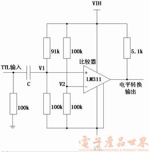 比较器翻转,输出为VIL;当TTL输入为高电平时,同样,V1略高于V2,输出为VIH。由于电容充放电,输出端电平不能长久保持在低电平,选取足够大的电容可满足本系统的测试需要。