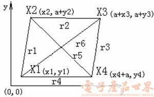但是当正方形测试结构发生形变,不能构成严格正方形时(如图2所示),此时,由物理基础和电学原理求得的结果为: