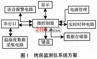 首先拟定监测仪的系统方案。监测仪主要由微控制器、显示、语音报警、实时时钟、外挂存储器、串口、温湿度数据采集电路以及键盘、电源几部分组成,如图1所示。