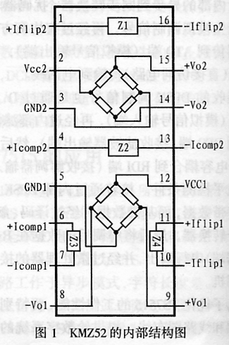 图1是KMZ52的内部结构框图和引脚排列。图中,Z1和Z4为翻转线圈,Z2和Z3为补偿线圈。由于环境温度可能会影响系统精度,因此,在高精度系统中,可以通过补偿线圈对其进行补偿。KMZ52内部有两个正交的磁场传感器? 分别对应二维平面的X轴和Y轴。磁场传感器的原理是利用磁阻(MR)组成磁式结构,这样可改变电磁物质在外部磁场中的电阻系数。以便在磁场传感器的翻转线圈Z1和Z2上加载翻转电信号后使之能够产生变化的磁场。由于该变化磁场会造成磁阻变化(ΔR)0并将其转化成变化的差动电压输出,这样,就能根据磁场大小正比于输出差动电压的原理,分别读取对应的两轴信号,然后再进行处理计算即可得到偏转角度。