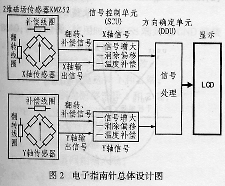 Philips公司生产的半导体器件KMZ52是一种专门用于电子指南针的二维磁场传感器。它采用磁场传感器的磁阻(MR)技术,并用翻转技术消除信号偏移,而用电磁反馈技术来消除温度的敏感漂移。由于外界存在干扰,该系统集成了几种特殊的抗干扰技术来提高系统精度。
