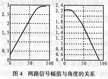由于KMZ52的输出信号很微弱,故信号干扰较大。在输出幅值很小的位置上,通常有300mV左右且变化很大的干扰;而在输出幅值时则近似保持恒值。两路信号幅值与角度的关系如图4所示。
