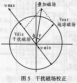 让整个系统在水平面上旋转一周,干涉磁场与地球磁场叠加会有一个最大值Vmax和一个最小值Vmin,记录下这两个值和达到最大值(或最小值)的角度φ,再经过校正,即可消除磁场的影响。现以图5所示的干扰校正方案为例来加以说明。