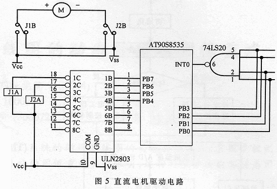 直流电机驱动电路的硬件结构如图5所示。本控制仪的执行机构是两个直流电机。用于控制前后风门的开启量。两个直流电机的驱动电路完全相同,图5中仅给出了一路驱动电路的示意。直流电机的驱动由八路功率驱动芯片ULN2803A和微型继电器实现。AT90S8535 PB口的高四位通过ULN2803A中的四路分别控制两个直流电机的正反转。前后风门各加两个起保护作用的限位开关,四个门限信号通过74LS20送到外中断0,同时分别和AT90S8535的PB口低四位连接,一旦有门限信号产生,中断服务程序则扫描PB口低四位,确定信号位置后立刻关断相应的电机。
