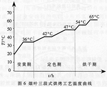 国家烟草局推广的烟叶三段式烘烤工艺使烟叶的工业成品率有了很大的提高。该工艺将烟叶的烘烤过程分为三个阶段,第一阶段为变黄期,第二阶段为定色期,第三阶段为烘干期。各阶段中对烤房的温度要求如图6所示。KF-1型烟叶烤房温湿度自动控制仪的软件控制方式是为实现该工艺的温度控制曲线而设计的。