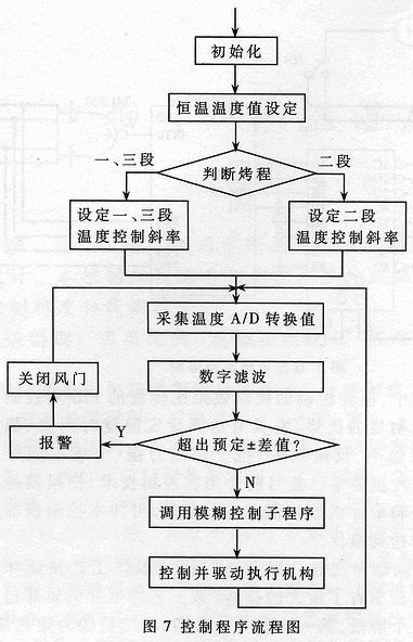 在三段式烟叶烘烤过程中,温度控制曲线要求第一、三段的升温按照每小时1℃的固定斜率均匀升温,第二段的升温按照每小时0.5℃的固定斜率均匀升温。温度确定确认后,单片机首先根据输入的各烤程温度设定值(即该烤程的恒温值)确定升温斜率以及和升温斜率对应的定时间隔;接着将采集到的环境温度作为起始温度值,并按照确定的时间隔将起始温度值不断地均匀提升为新的设定值;然后由模糊控制程序根据控制精度跟随这个均匀提升的设定值对烤房温度进行控制。当烤房内这个均匀提升的设定值对烤房温度进行控制。当烤房内温度达到烤程的温度设定值时,结束升温控制过程,进入恒温控制状态。烤房内湿度的控制方式和温度控制方式类似。控制程序流程如图7所示。