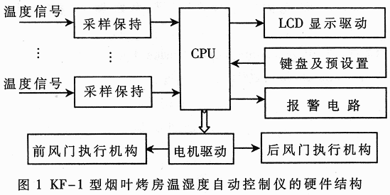 KF-1型烟叶烤房温湿度自动控制仪是针对国家烟草局在闽南地区推广的烟叶烤房项目而设计的。这种类型的烟叶烤房前后均开设一个“门”,前门负责煤燃烧室的给风。需要增加火力升温时加大前门的开启量,从而使得烤房内温度升高;反之减小其开启时甚至关闭,使得烤房内温度降低。后门用于调整烤房的湿度,湿度过高时加大后门的开启量;反之减小其开启量甚至关闭。KF-1型烟叶烤房温湿度自动控制仪的硬件结构如图1所示。