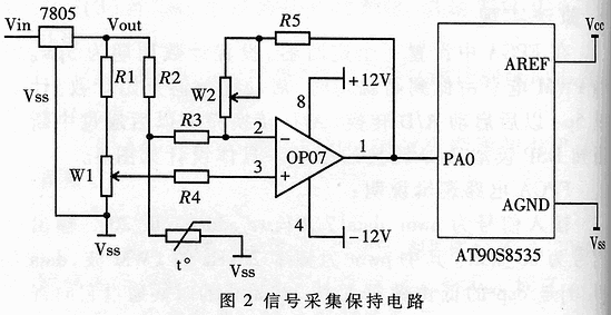 信号采集保持电路如图2所示。KF-1型烟叶烤房温湿度自动控制仪最多可处理6路温度和湿度输入信号,图2所示为其中的一路。温、湿度传感器选用半导体热敏电阻,运放选用精密运算放大器OP07,集成稳定块7805给OP07的正输入端提供基准电压,传感器采集的温、湿度信号送到OP07的负输入端,电位器W1用于调节采样基准,电位器W2用于调整运放的放大倍数。多路温、湿度传感器采集的温、湿度信号分别经过信号采集保持电路处理后送到AT90S8535的PA口进行A/D转换。
