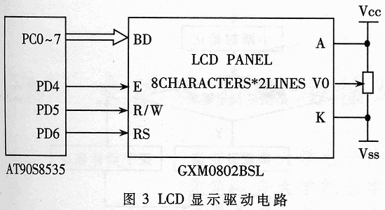 这款液晶显示器可显示两行字符,每行八位。AT90S8535的PC0~PC7和LCD的八位数据线连接,PD4~PD6与LCD的控制线连接,通过软件编程实现显示功能。