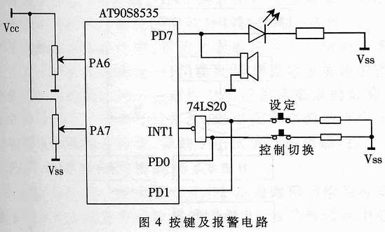 本控制仪设计有两个按键,一个用于设定温、湿度显示和实时检测温、湿度显示之间的切换,另一个用于实现自动控制和人工控制之间的切换。两个按键分别通过74LS20接外中断1,同时与AT90S8535的PD0和PD1口连接。当有按键按动时,产生一个中断信号,由中断服务程序扫描PD0和PD1口,确定是哪一个按键请求中断,然后调用相应的服务程序。报警电路选用声光报警,当实际温度和设定温度的差值超出预定范围时,声光自动报警的同时控制执行机构的驱动电路动作。另外,A/D转换接口的PA6、PA7分别接一个精密电位器,用于预置温湿度值。在按动温度设定按键后,手动调节精密电位器来设定温湿度,然后在一次按动温度预定键予以确认。其硬件构成如图4所示。