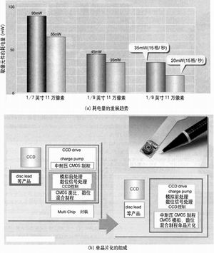 相较于CMOS的急起直追,CCD厂商也加快步伐进行新技术开发,其中又以三洋电机最积极。如图9所示该公司自从2001年2月首度推出照相手机用11万像素CCD取像组件之后,便不断进行耗电量的改善,由图可知2001年1/7英寸11万像素CCD取像组件的耗电量是90mW,2003年2月问世的1/9英寸11万像素CCD取像组件的耗电量只有35mW,单就耗电量而言,该CCD不比CMOS的40~80mW逊色。有关低耗电量的改善,三洋电机坚持采取其它厂商非常忌讳的Frame Transfer方式(以下简称为FT),由于光电二极管与电荷转送部分可作成一体化,因此FT可比其它方式更易获得低电压化效应,例如垂直CCD的工作电压其它公司是12~15V,三洋电机的CCD则只有一半大约是7~8V左右,此外只需中耐压工艺即可,因此更容易与其它数字电路整合,以耗电量为35mW的CCD为例,该CCD就是将周边的驱动电路、电源电路、模拟前端处理电路与DSP整合成单芯片。值得一提的是FT方式的纵向光纹,极易沿着转送路径渗入造成smear噪声,三洋电机根据各列计算35mW的CCD的smear噪声,藉由消除smear噪声的影像演算处理进行补正。