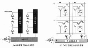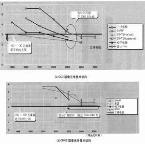 有关CCD与CMOS的应用争论是80年代CMOS取像组件问世后正式展开,90年代CCD成为数字相机与数字摄影机的取像组件主流,尤其是在数字相机领域,CCD更具有压倒性的占有率。CMOS取像组件为了避免与CCD正面决战,因此在行动电话等领域另辟战场并获得大胜,不过却也招致CCD的觊觎,并且迅速与CMOS形成竞争局面,2003年开始取像组件的像素数从30万一口气提高4倍,甚至超过130万像素以上,使得CCD取像组件更因它的影像品质优势蚕食CMOS既有的生存空间 (图1)。