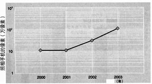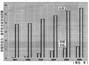 由于CMOS与CCD两者的优缺点随着技术的进化,以往所谓的“要求高画质的高阶产品使用CCD,低耗量电低价为诉求时使用CMOS”壁垒分明的格局,正受到行动电话的发展快速瓦解,形成二分天下相互竞争的局面,该趋势可见图3,2002年内建取像镜头的行动电话已经成为市场主流的统计结果获得证实,一般认为2005年全球照相手机的比率可达20%,届时市场规模将超过1亿台(图4)。