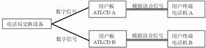 图1是两个固定电话用户A和B建立通话时的信号连接图。在信号传输过程中,用户板需要提供数模转换,模数转换,编码解码,多路复用(一个用户板可以连接多个模拟电话机)等功能,而在建立通话的过程中,用户板还需要提供摘挂机检测、振铃等功能。