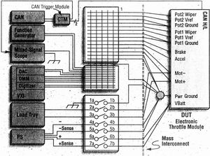 一旦做出高级结构决定,则工程技术人员注意力集中在适于专门DUT的详细仪器要求,在本实例中,是在3个连接器上具有14引脚的一个电子调节模块。根据测试性能指标,需要下列仪器: