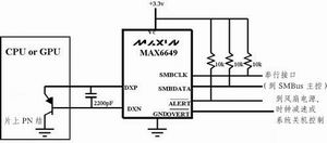图2 MAX6649对CPU和图形处理器上的测温二极管进行测量,在60℃~145℃ 范围内的测温精度达1℃。测量高达150℃的温度时精度降低。