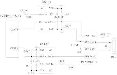 可以看到,这个CAN节点主要是在DSP的基础上增加了一个CAN发送器PCA82C250。需要注意的是:2407采用低功耗设计,3.3V供电,而CAN发送器PCA82C250是5V供电,假如直接相连,2407肯定无法承受。采用两路光耦6N137不仅起到隔离DSP和CAN总线的作用,而且在保护DSP芯片的同时又可以进行电平转换。当然进行电平匹配,还可以采用专门的电平转换芯片,或者CPLD芯片。CAN节点的通信有三种通信模式:高速模式、斜率控制模式、等待模式。三种模式的选择是通过PCA82C250端子的接法来实现的。高速模式下要求接一个0 ~1.8kW的电阻到地;斜率控制模式下要求接一个16.5kW~140kW的电阻到地;等待模式下要求RS接到高电平,至少保证RS的端电压大于0.75VCC。显然图2采用的是斜率控制模式。至于CAN总线的终端匹配电阻的选择并不是固定的,这与所设计的CAN网络的节点个数,采用的传输介质等都有关系。终端电阻主要起到吸收信号的作用,对于较大型的CAN网络,一般在CAN总线的两端各接上一个几百欧的电阻,对于只有几个节点的试验系统,可以在每个节点的接口处接上一个几百欧或稍大一些的电阻都是可以的。