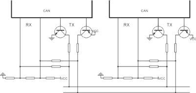 CAN控制器并不一定需要接CAN发送器才可以接到CAN上的。图3中CAN控制器通过采用一些分立的元件直接连到总线上,这种方法的不足在于必须很细致地调节电阻参数,使其满足在显性和隐性情况下,CANH与CANL的电平满足图1的形式。在隐性情况下,VCANH与VCANL被固定于平均电平下,Vdiff近似为零。在显性情况下以差分形式表示,这样可以达到抗共模干扰的作用,而且这样的连接形式只能下挂30个节点。加上CAN收发器后,不仅可以提供对总线的差动发送和接收的功能,同时也大大增强了总线的驱动能力,通信速率可达最高1Mbps,还可最大挂接110个节点。
