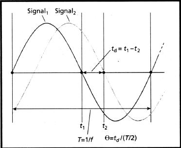 但如果使用MathCAD,就可容易下载FFT数据,并提取相位和振幅信息。图3和下列公式示出如何在时域测量两路模拟信号的相位q。