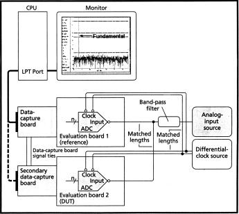 例如可使用两个ADC,一个作为基准,另一作为DUT,将基准ADC焊接于一个评估板,在另一评估板装一插槽,以方便随时插、卸DUT。图4是具体的测试方案,两个ADC评估板使用相同的时钟和信号源。另外匹配电缆和连接器长度都很短,在评估板上,所有采样时钟驱动电路都已被拆掉。数据采集板有2n位,与控制器件和DUT相同,注意要将一些数据采集线接到一起,以便同时采集数据,如何连接依不同系统而变,但对于每一个ADC,系统采集数据时,都要保证在相同的时钟边沿。