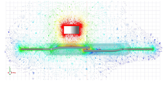 图 2簧片开关的仿真响应,显示了两片簧片尖端之间的集中磁通密度