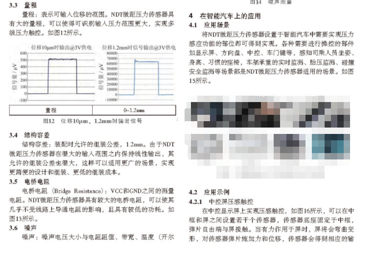 将NDT微距压力传感器设置于智能汽车中需要实现压力感应功能的部位,如中控台、显示屏、方向盘、按键、门把手、尾板、座椅等,即可提供更精准、更真实的智能压感触控体验。