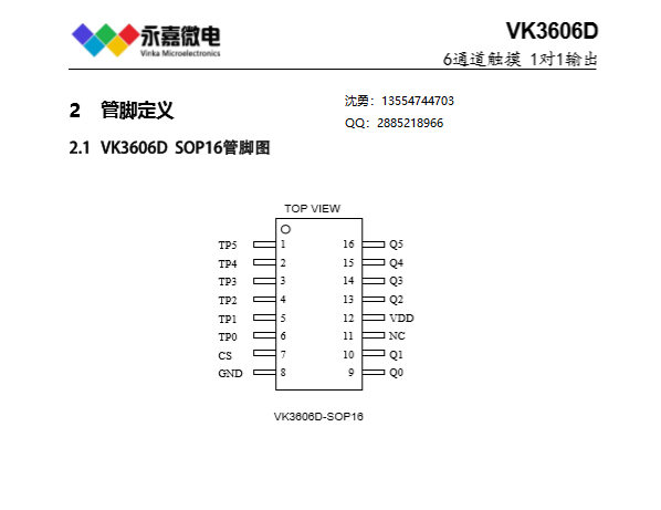VK3606D具有6个触摸按键,可用来检测外部触摸按键上人手的触摸动作。该芯片具有较高的集成度,仅需极少的外部组件便可实现触摸按键的