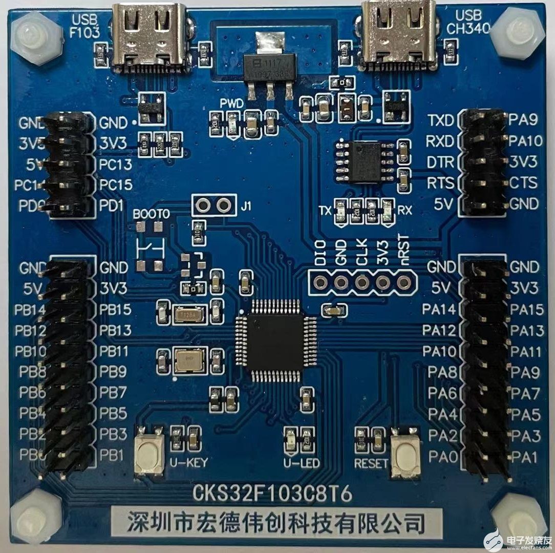 由深圳市宏德伟创科技有限公司自主、原创设计的CKS32F103C8T6最小系统开发板,是一款高性价比的32位ARM开发板。该开发板选用中国电子科技集团旗下的中科芯(CETC)出品的CKS32F103C8T6 作为主控芯片。该款芯片最多的亮点和特色之处在于:它跟ST公司的STM32F103C8T6是硬件引脚Pin2Pin的,而且软件也不需要修改就可以正常运行!