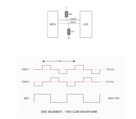 考虑最简单的LCD显示器。它只有一个细分。要操作该网段,它必须具有一个底板,通常称为COM平面。在段(SEG)和COM之间施加电压以接通段。为了停止在段上建立DC电压,请切换电压,以便有效DC电平为0,段上的电压是恒定的。切换速率称为刷新速率,应在30 Hz到75 Hz之间。较低的频率可能会导致闪烁,但较高的频率可能会产生“重影”效果,其中段关闭可能需要更长的时间才能关闭。较高的频率可能还会使用更多的功率,因此最好选择尽可能低的频率,但不要让显示器闪烁。