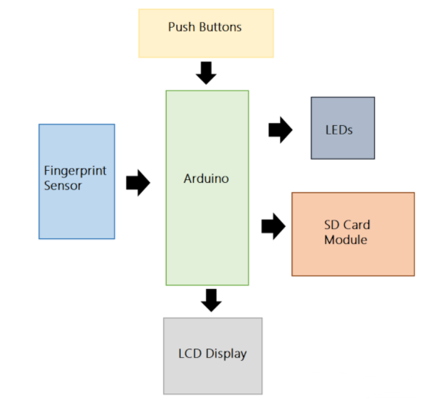 为了获得用户输入,指纹扫描仪直接与Arduino交互。 LCD模块和LED指示输出结果。 SD卡模块将出勤记录保存在SD卡上。可以使用两个或多个按钮来控制不同的过程。