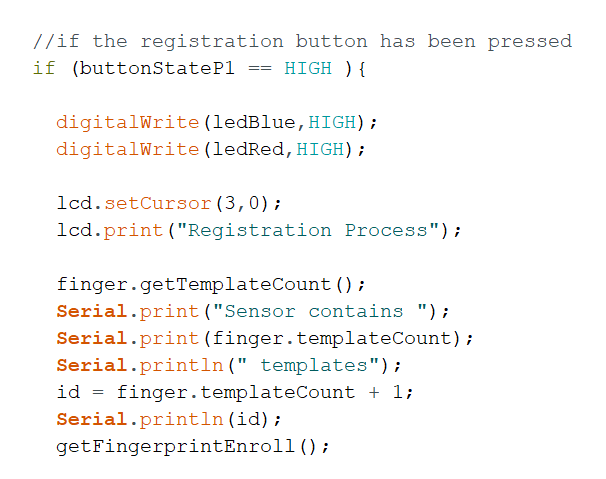 如您所见,我们首先必须找到已存储在传感器中的指纹数量。我们可以使用getTemplateCount()函数获得该数字。由于存储位置编号从0开始,因此通过将数字增加1来设置ID。ID号是全局变量。因此,存储指纹时,分配的ID号将在getFingerprintEnroll()函数中使用。