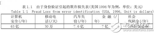 现行的许多计算机系统中,包括许多非常机密的系统,都是使用“用户ID+密码”的方法来进行用户的身份认证和访问控制的。实际上,这种方案隐含着一些问题。例如,密码容易被忘记,也容易被别人窃取。而且,如果用户忘记了他的密码,他就不能进入系统。调查表明,因为忘记密码而产生的问题已经成为IT厂商售后服务的最常见问题之一;密码被别人盗取则是一件更可怕的事情,因为用心不良的人可能会进一步窃取公司机密数据、可能会盗用别人的名义做不正当的事情、甚至从银行、ATM终端上提取别人的巨额存款。实际上,密码的盗取比较容易,别人只要留意你在计算机终端前输入口令时的击键动作就可以知道你的密码,甚至可以通过你的生日、姓名、电话号码或者其他一些信息猜出你的密码,这就显得极不安全。众所周知,高度机密的美国一些军事机构计算机网络(包括五角大楼和国防部)曾不止一次被黑客侵入,黒客们实际上就从是破解这些计算机网络的某一合法用户的密码而入侵的。尽管现行系统可以通过要求用户定时改变他们的口令来防止盗用口令行为,但这种方法不但增加了用户的记忆负担,也不能从根本上解决问题。表1.1给出了美国在1996年因为身份验证引起的欺诈损失。