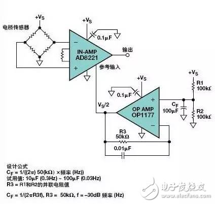 上面示出的CF试用值能够提供大约0.03 Hz的–3 dB极点频率。接在R3两端的小电容器(0.01 μF)可使电阻器噪声最小。