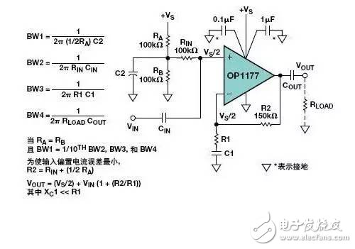 最后,单电源运算放大器电路需要偏置共模输入电压幅度以控制AC信号的正向摆幅和负向摆幅。当从电源电压利用分压器提供偏置电压时,为了保证PSR的性能就需要合适的退耦。