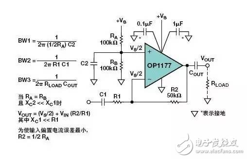 一种常用但不正确的方法是利用100 kΩ/100 kΩ电阻分压器(加0.1μF旁路电容)提供VS/2给运算放大器的同相输入端。使用这样小的电容值对电源退耦通常是不够的,因为极点仅为32 Hz。电路出现不稳定(“低频振荡”),特别是在驱动感性负载时。