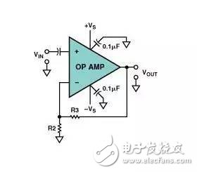图12.单电源同相输入放大器电路正确的电源退耦方案。中频增益=1+R2/R1