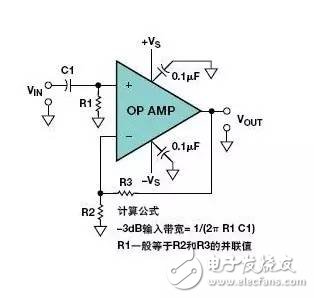 最常遇到的一个应用问题是在交流(AC)耦合运算放大器或仪表放大器电路中没有提供偏置电流的直流(DC)回路。在图1中,一只电容器与运算放大器的同相输入端串联以实现AC耦合,这是一种隔离输入电压(VIN)的DC分量的简单方法。这在高增益应用中尤其有用,在那些应用中哪怕运算放大器输入端很小的直流电压都会限制动态范围,甚至导致输出饱和。然而,在高阻抗输入端加电容耦合,而不为同相输入端的电流提供DC通路,会出现问题。