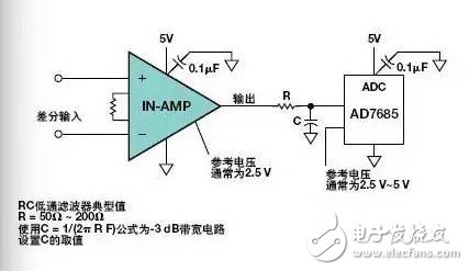 图7示出一个仪表放大器驱动一个单端输入的模数转换器(ADC)的单电源电路。该放大器的参考电压提供一个对应零差分输入时的偏置电压,而ADC的参考电压则提供比例因子。在仪表放大器的输出端和ADC的输入端之间通常接一个简单的RC低通抗混叠滤波器以减少带外噪声。设计工程师通常总想采用简单的方法,例如电阻分压器,为仪表放大器和ADC提供参考电压。因此在使用某些仪表放大器时,会产生误差。