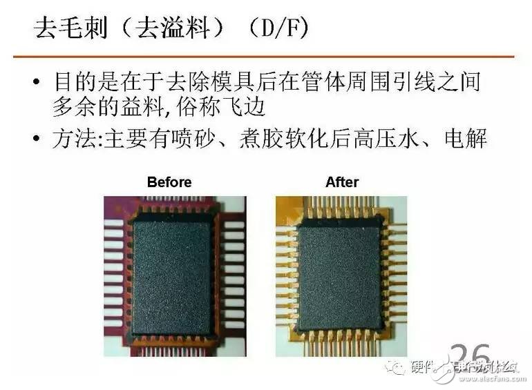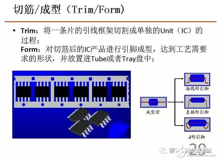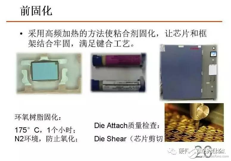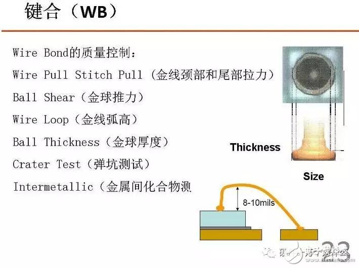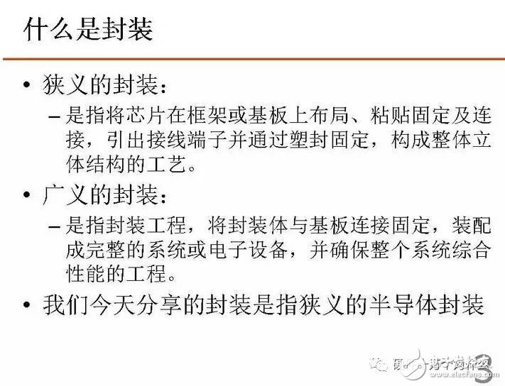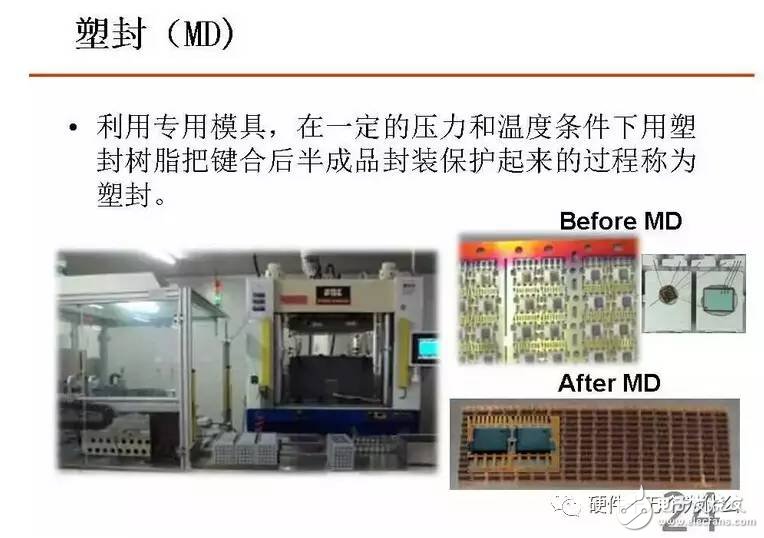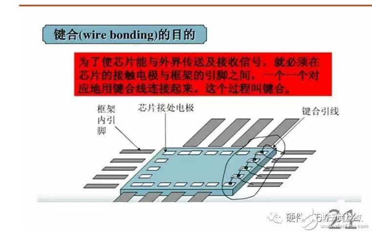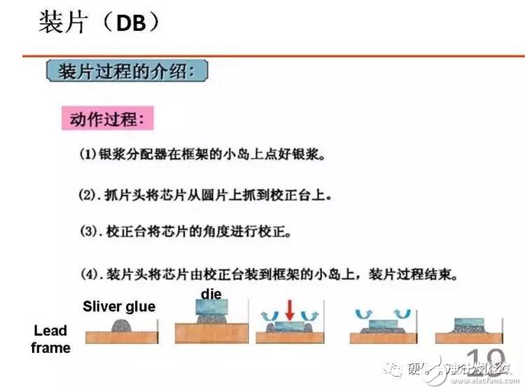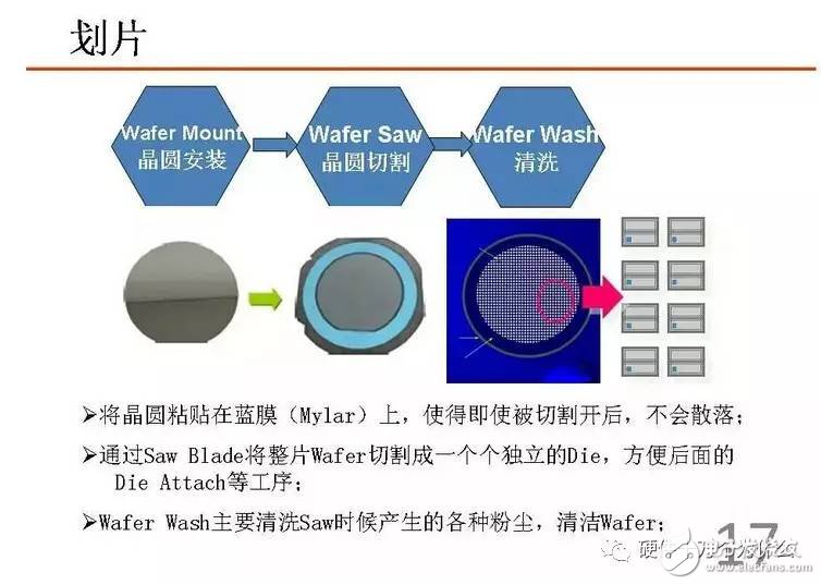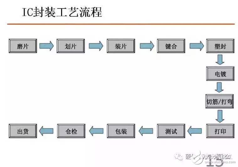 封装的工序比较复杂,大概有十几道工序,有磨片、划片......磨片就是让圆片背面减薄,适应封装需要;划片就是通过金属刀片,让晶圆能够一粒一粒地分割出来;装片就是通过导电胶,让芯片跟引线框固定起来;键合就是通过芯片的pad与框架之间实现电路导通;塑封就是把产品包装起来。里面的关键工序是“键合和塑封”,键合实现了我们的目的,塑封对键合实现品质保证和产品的可靠性。