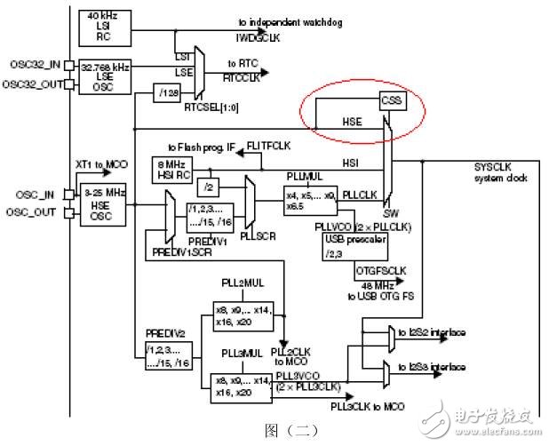 STM32 中的 CSS 功能是专门为检测和处理 HSE 失效而设计的。但该功能在 STM32 复位后是被禁止的,须要软件对其使能才会发挥作用。当 CSS 单元检测到 HSE 失效时,它会使能 HSI,并将系统时钟切换到 HSI。同时,它会关闭 HSE,如果 PLL 的输入信号来自 HSE的输出,它也会关闭 PLL。CSS 单元在做时钟调整的同时,也会产生一个 NMI 中断请求,和一个送给高级定时器的刹车信号。NMI 中断请求会产生一个 NMI 中断,以便用户程序可以在中断服务程序中做紧急处理,而刹车信号则是使高级定时器进入刹车状态,以防止由其控制的电机驱动桥臂由于失去控制而过流。用户程序可以在 NMI 中断服务程序中尝试恢复 HSE 及 PLL 的功能,也可以使用陷阱让程序的流程停留在服务程序中,从而等待看门狗复位整个系统。