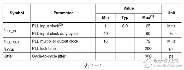 从 STM32F103VD 的数据手册中查找 PLL 相关的参数如表(一):