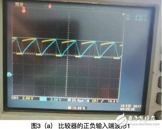 从图3波形中可以看出,调整R11,可以改变三角波的频率(黄色的为5脚波形,蓝色的为4脚波形),三角波的上升沿大于下降沿时间,当5脚电压为高时,电容充电,三角波处于上升沿阶段;当5脚电压为低时,电容放电,三角波处于放电阶段,这和之前设计时的分析相吻合,达到预期效果。